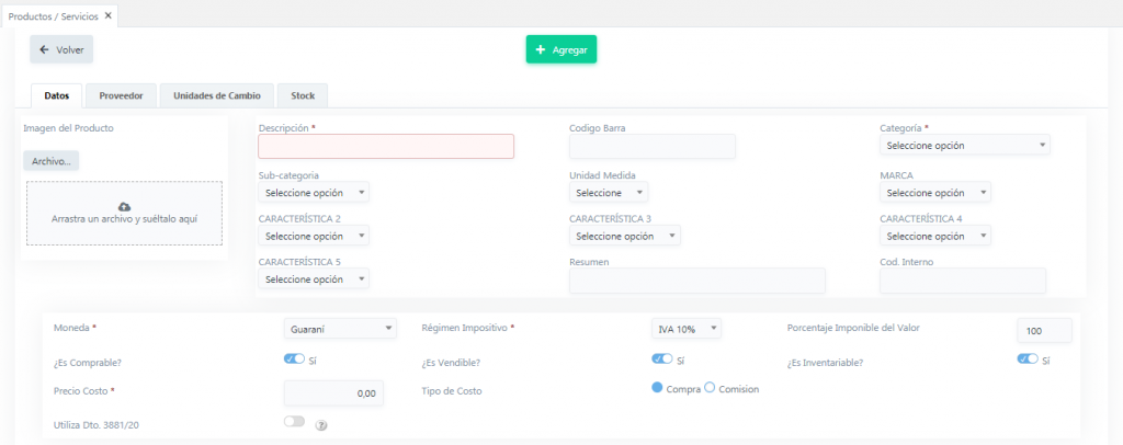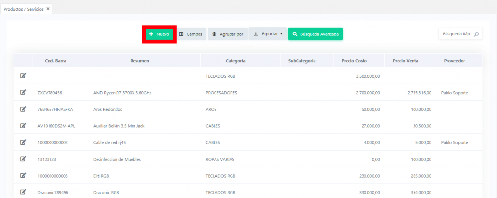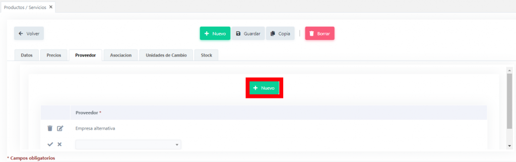 Para añadir un proveedor del producto/servicio haga clic en Nuevo.