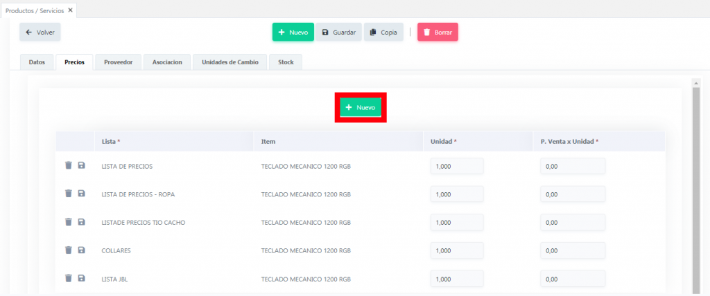 Para añadir el producto a una lista de precios haga clic en Nuevo.