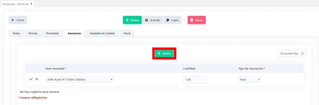 Para asociar el producto/servicio con otro ítem haga clic en Nuevo.